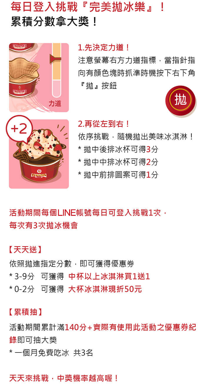 1.活動期間每個LINE帳號每天可參加活動乙次,有機會獲得冰淇淋優惠券(以下稱之「優惠券」)。